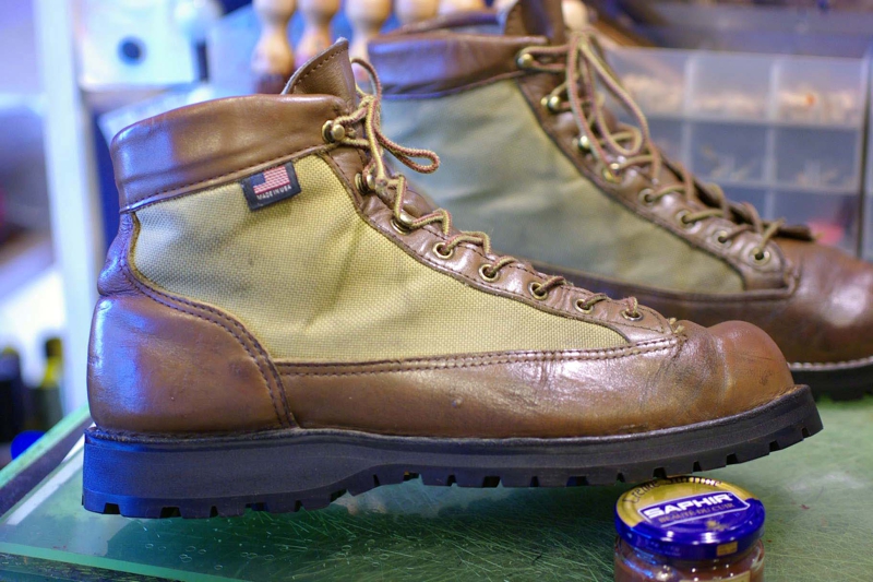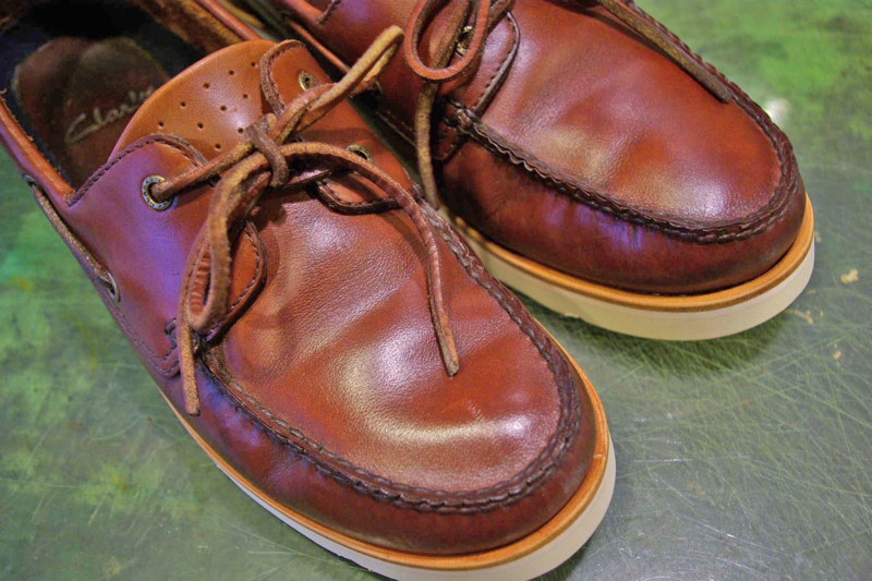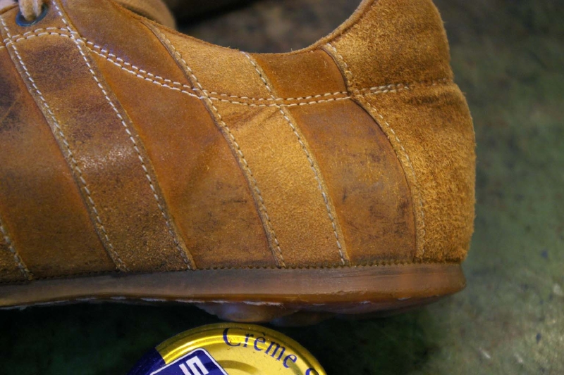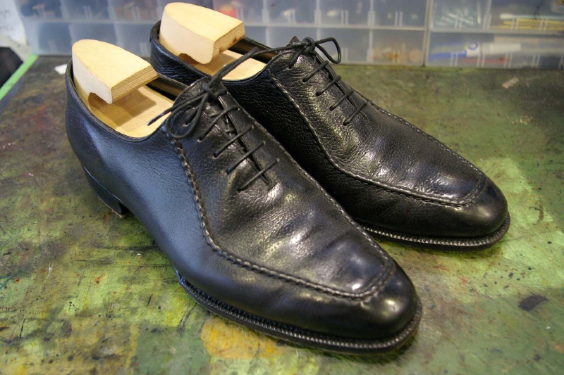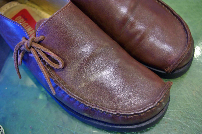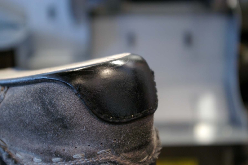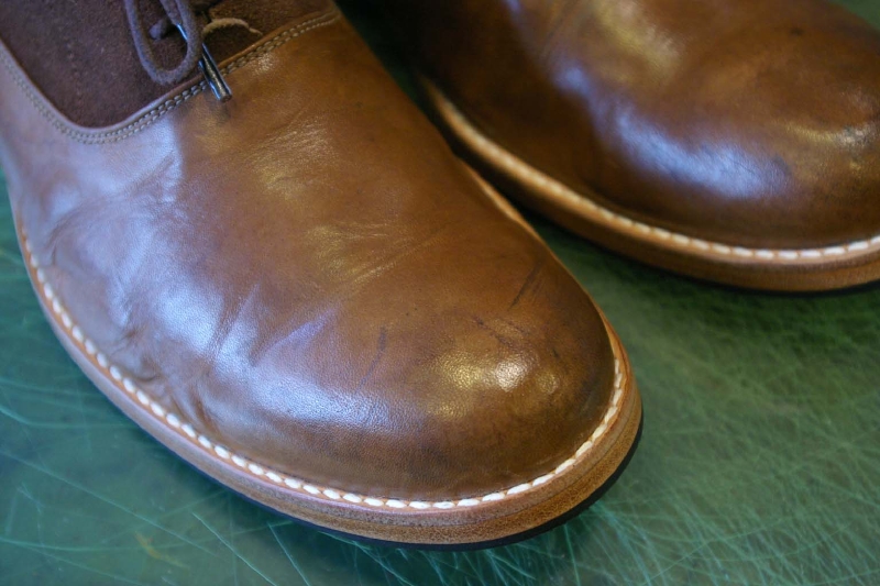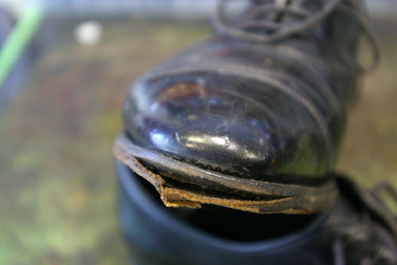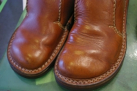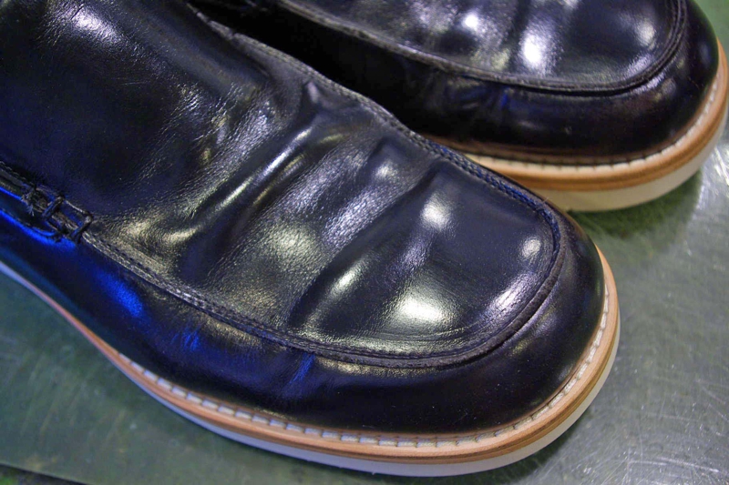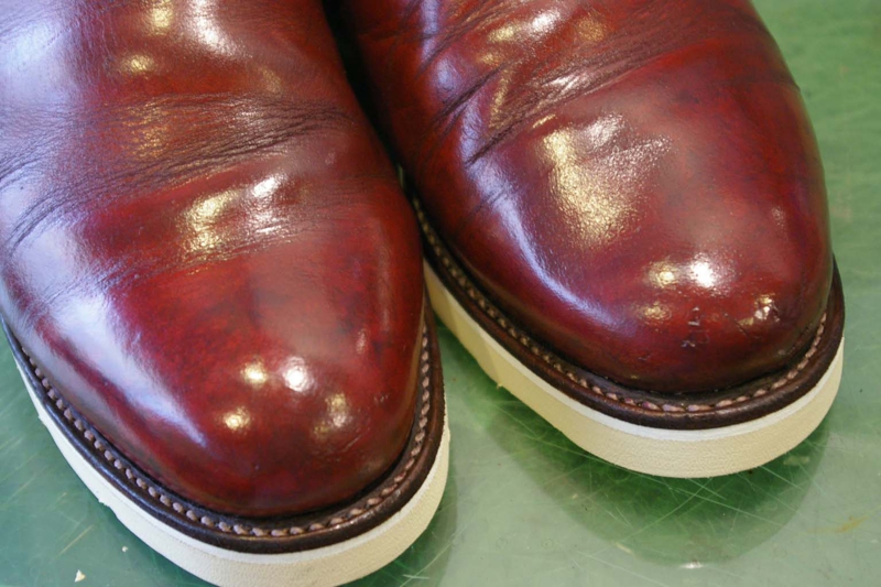 裂けている部分は、見えないように革で補修を行いました。また、つま先部分が