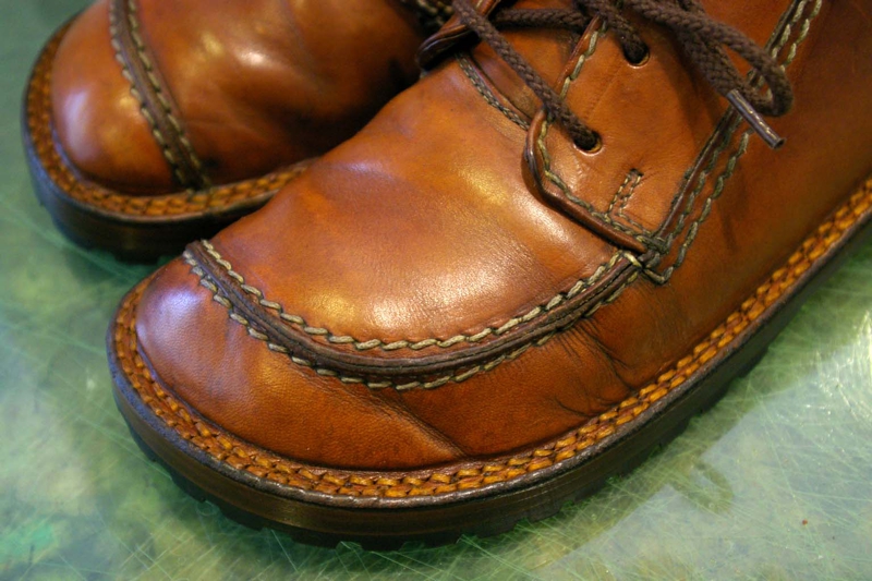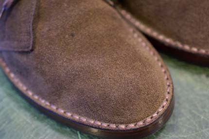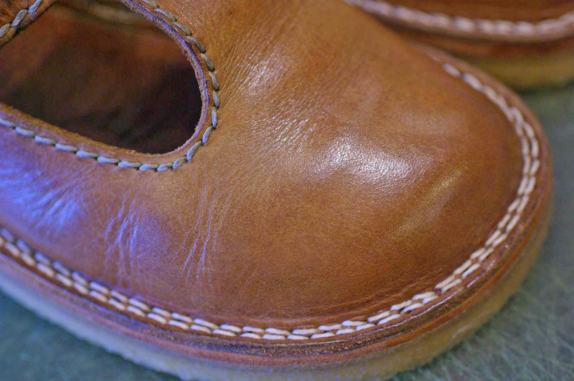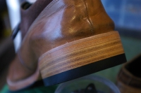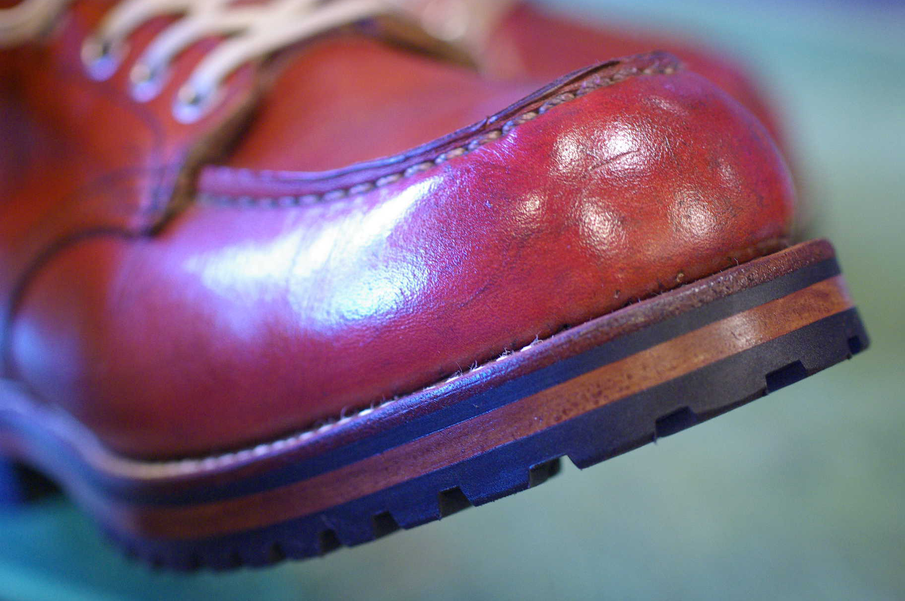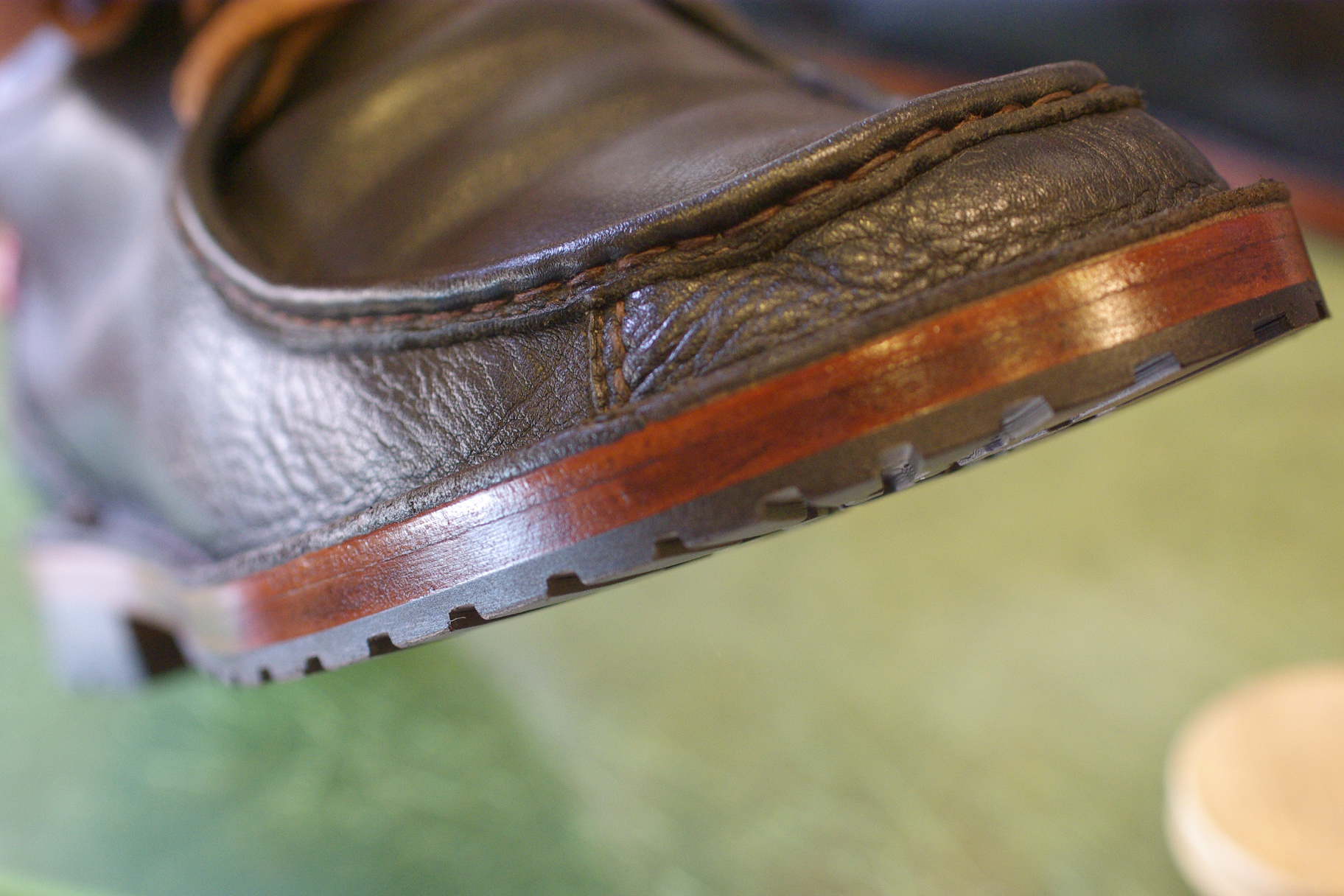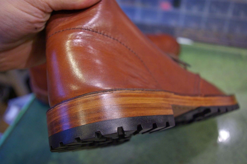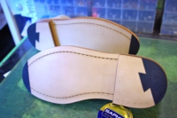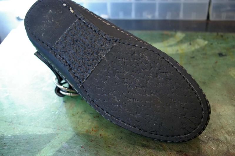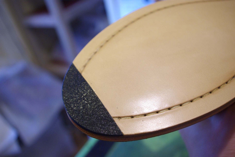 レザーソール仕様の場合は、特につま先の摩耗が早いので、あらかじめ底縫いを掛けた後に
