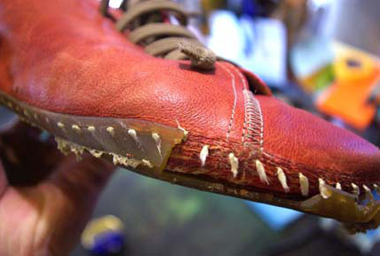 一般的な靴の場合ですと、底縫いの糸が切れても、併用された接着である程度