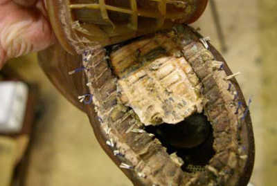 ソールを剥がしてみますと、既に中底はバラバラになり、どこかへ旅立っている場合もあります。